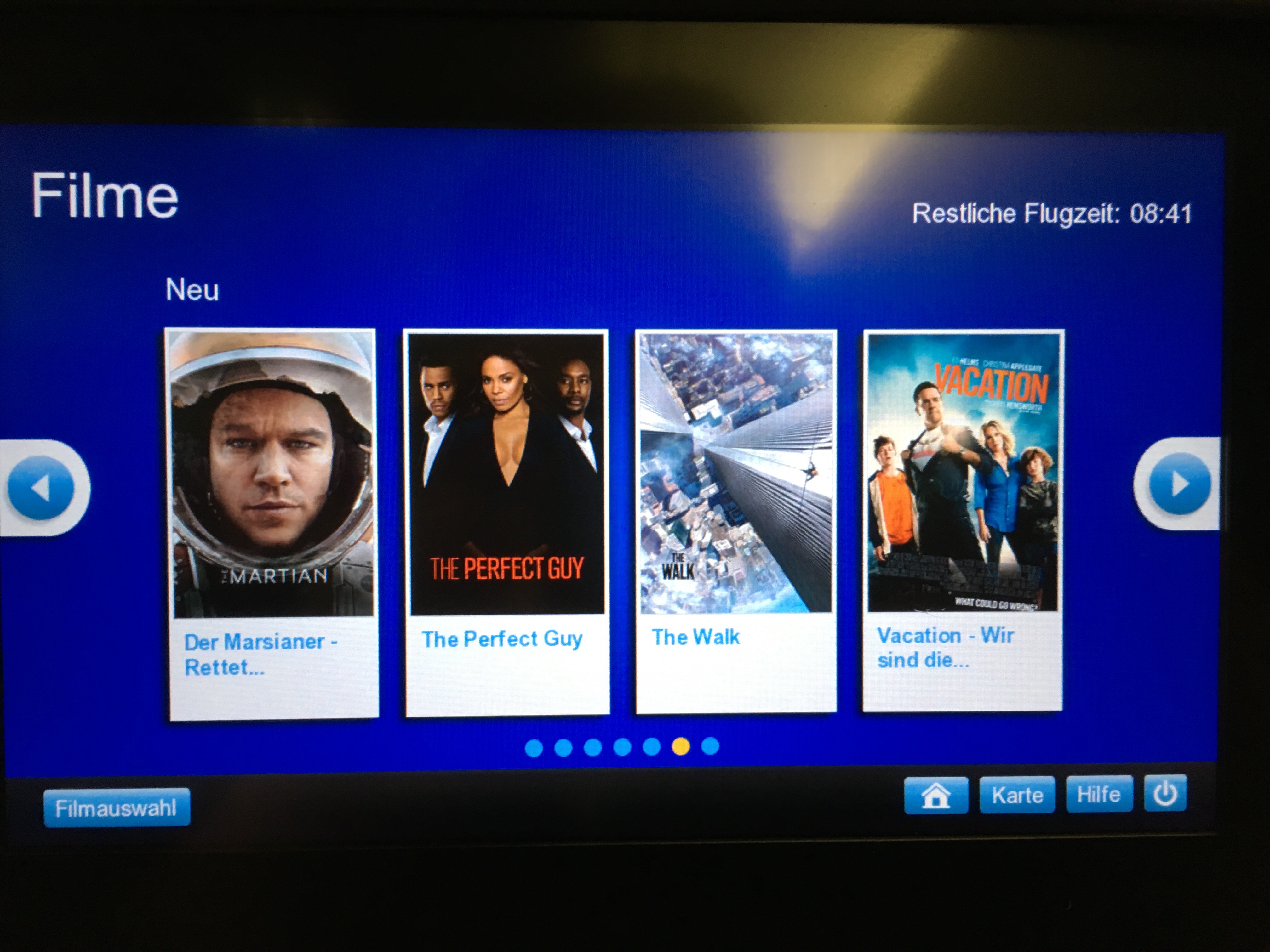 Das Flugzeug ist sehr modern, sehr gutes Entertainment system, Filme auch auf deutsch, diverse Spiele und Serien … Und inflight WLAN für 15 Euro.