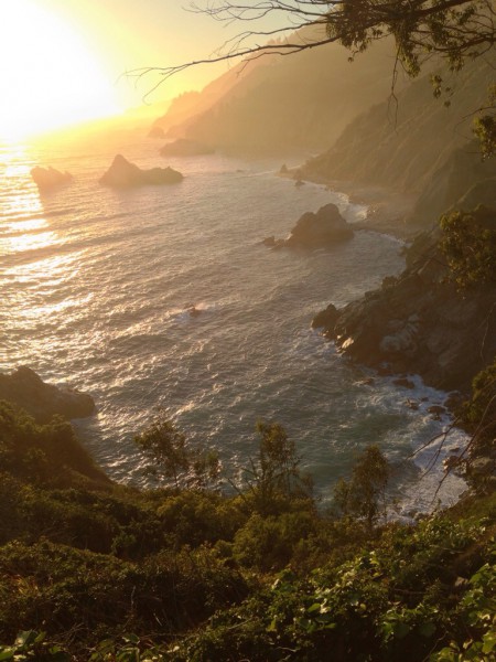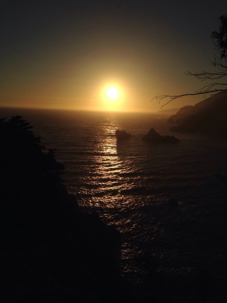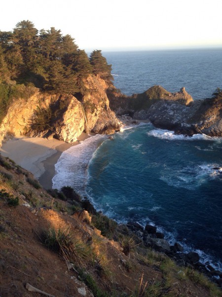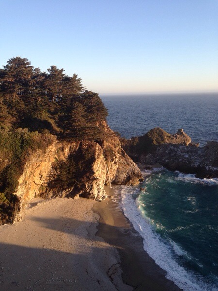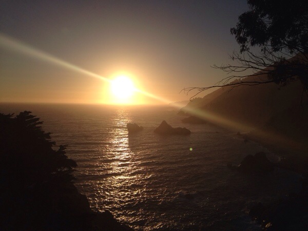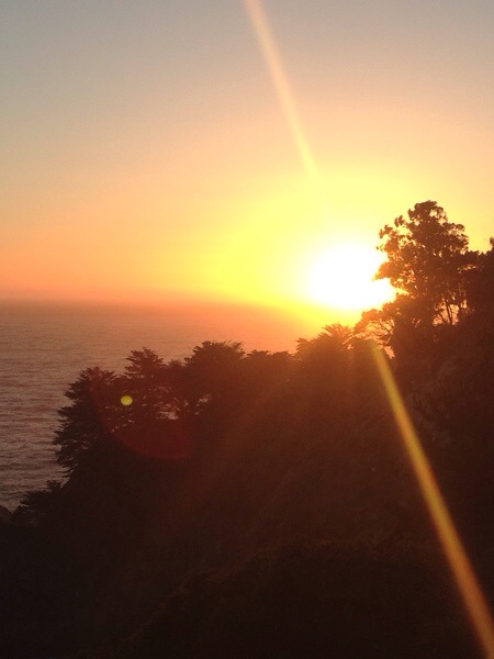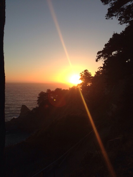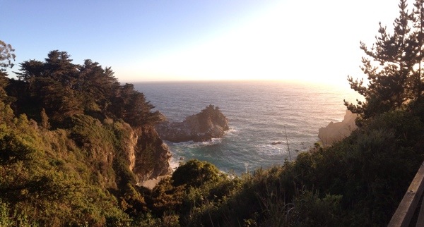 Danach noch eine hübsche Bucht mit Wasserfall und ein mittelmäßiger Sonnenuntergang. Jetzt wird’s duster, ist Immernoch Serpentinig und Susanne düst Immernoch. Mal schauen ob wir ein Motel finden
