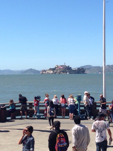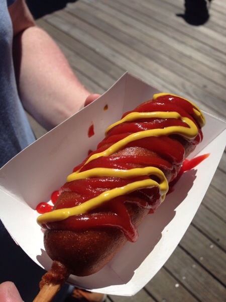Pier 39 war auch echt voll. Ich vermute mal es liegt am Feiertag. Gutes Wetter war ja auch, ich fürchte meine bereits großflächig gepellte Stirn ist nun wieder “gut durch”. Da gabs auch schöne Läden. Haben wieder ein paar Süßigkeiten eingelagert und es gab den ersten corn dog nach 3 Amerika reisen :).