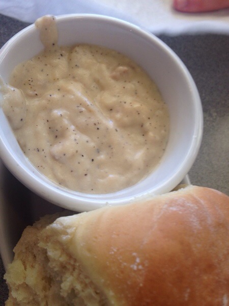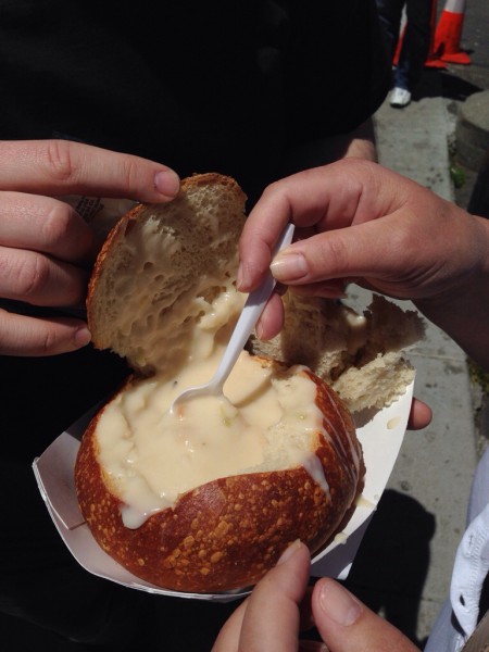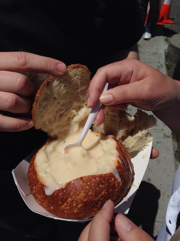 Susanne hat original Clam chowder in der Bread bowl bestellt und gegessen. War aber unspektakulär. Sehr milder fisch Geschmack.