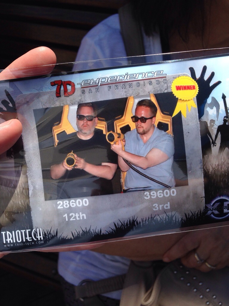 Zombies? Achja, Zombies! Es gab eine 7D experience. Jan sagte die müssen wir machen. Ich war ja etwas im Zweifel weil es eher wie ja für Kinder aussah. Gut das er sich durchgesetzt hat. Es waren zwar auch kleinere Kinder dabei (das Ding wär bei uns min. Ab 16) aber durchaus auch für erwachsene spaßig. Bewegliche Sitze und Windmaschinen plus 3D Bildschirm auf dem eben ein Zombie Spiel lief. 18 Leute die Zombies abknallen mit einem Laser. Inklusive highscore. Mein Ziel als Nerd war natürlich erster platz, hat aber leider nur zum 3. gereicht. Jan auf Platz 12. lustige Idee. Relativ kurz. Aber für 10 Euro in Ordnung. Grandiose Fotos. Haben auch eins gekauft